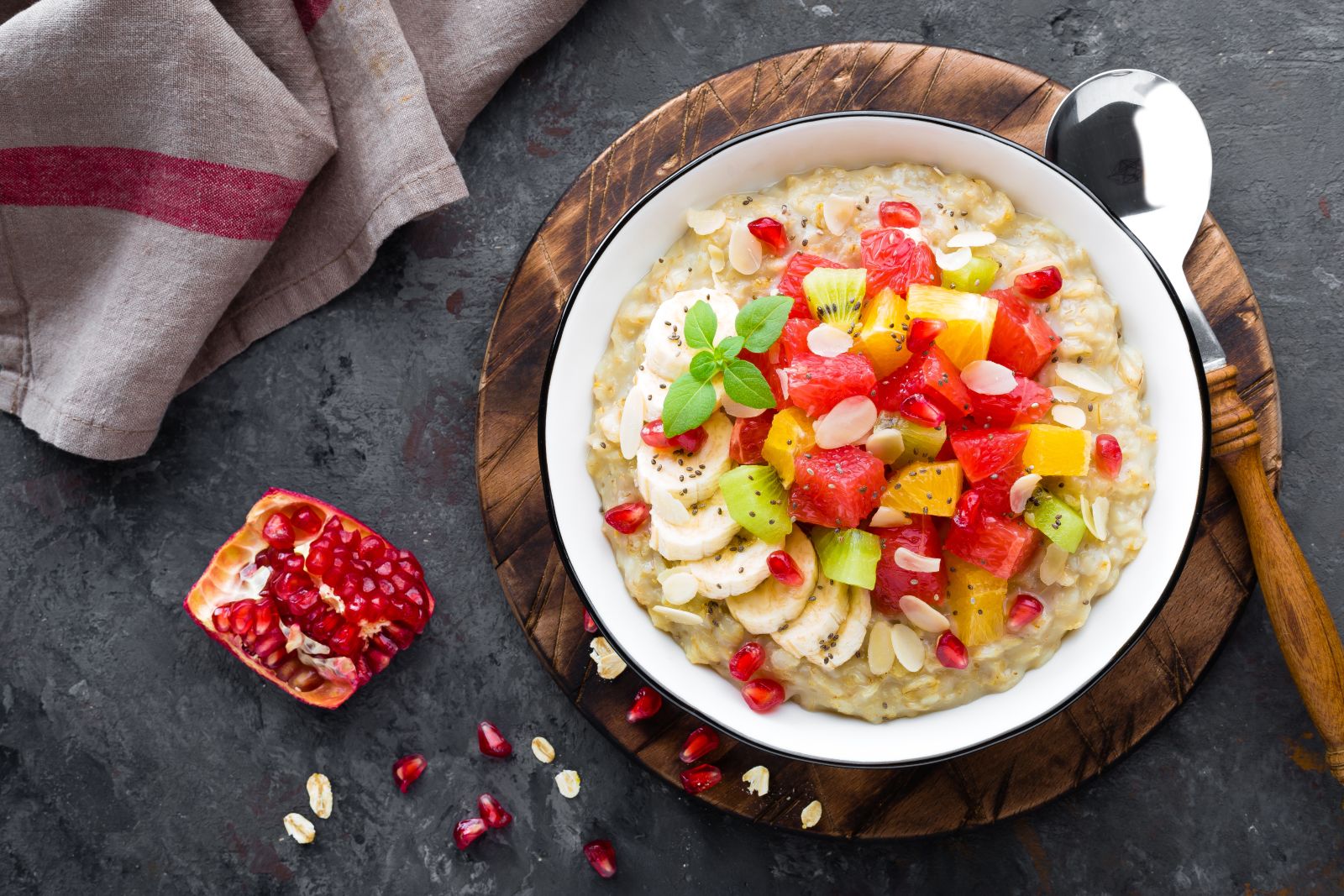 Siapkan oatmeal dalam mangkuk dan tambahkan potongan buah-buahan segar seperti pisang, stroberi, atau blueberry. kamu juga bisa menambahkan topping seperti kacang-kacangan atau chia seed untuk menambahkan protein dan serat.